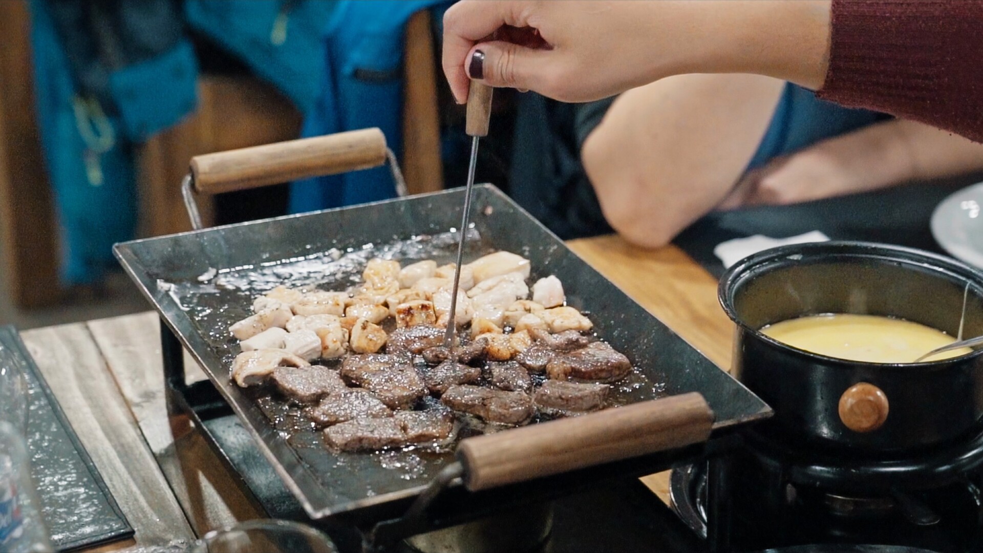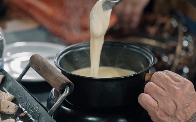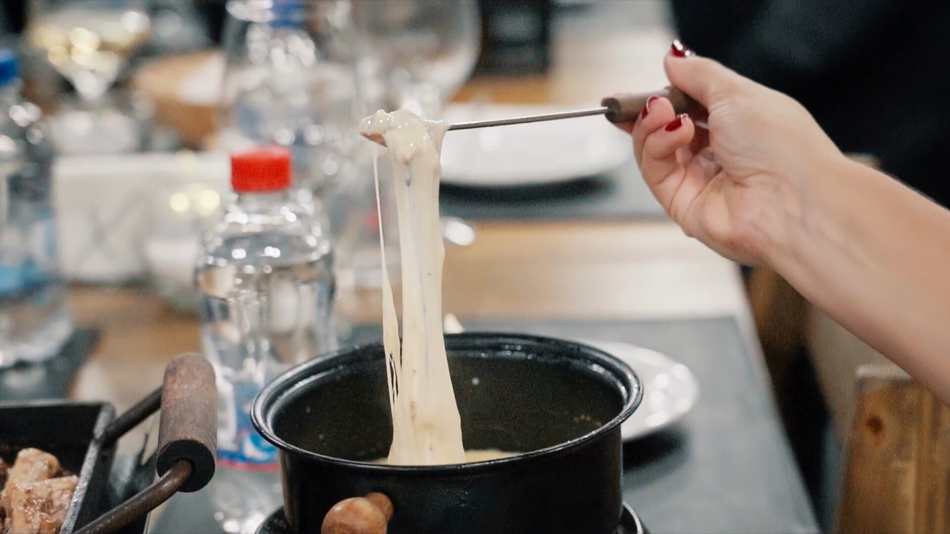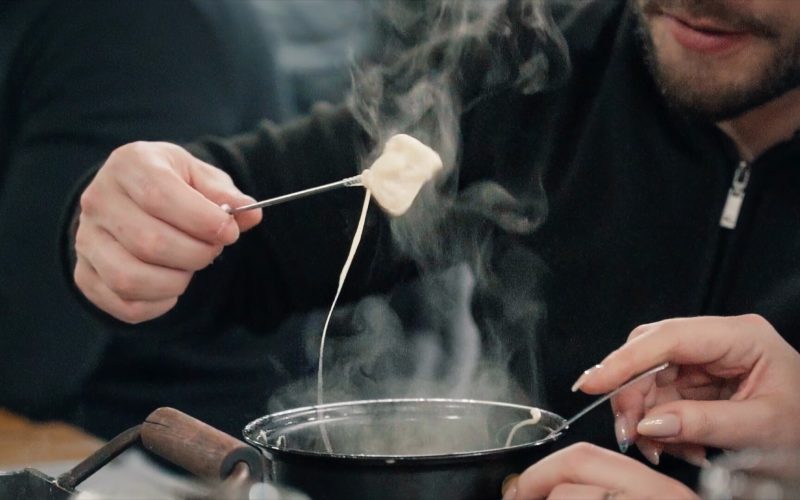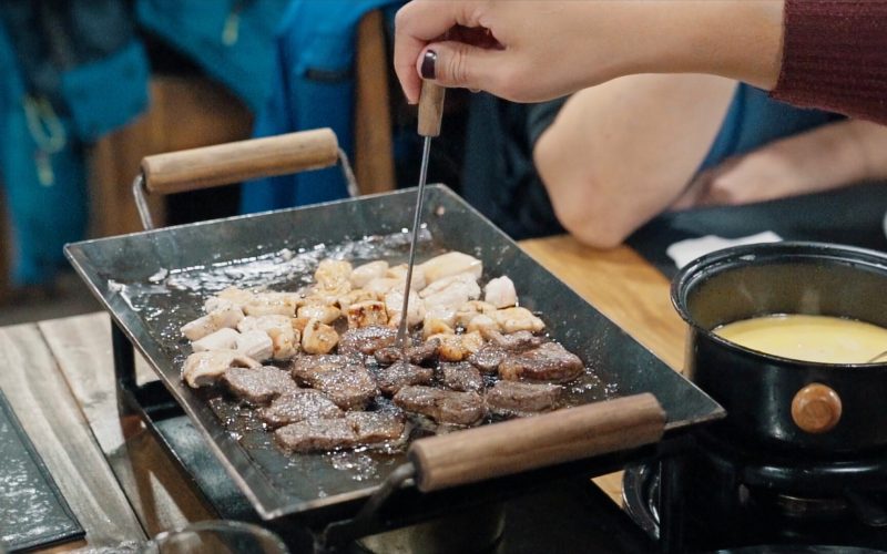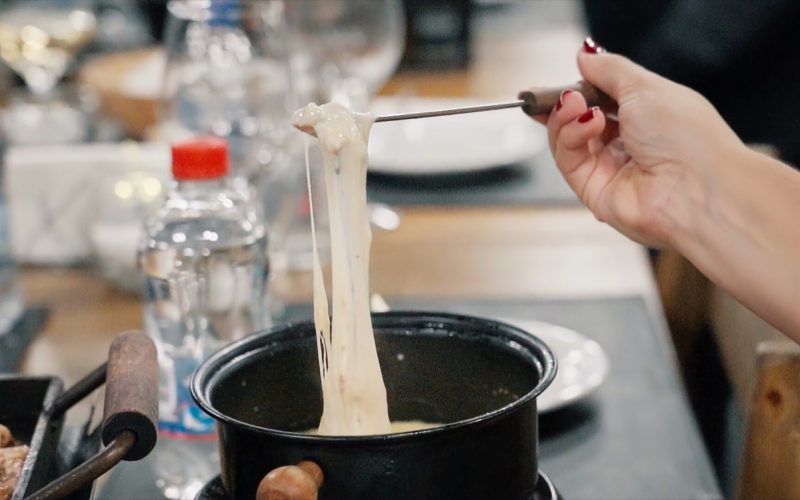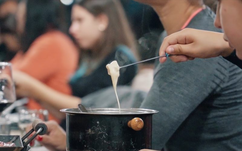 • Fondue de queijo acompanhado de carne e frango;