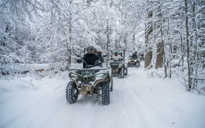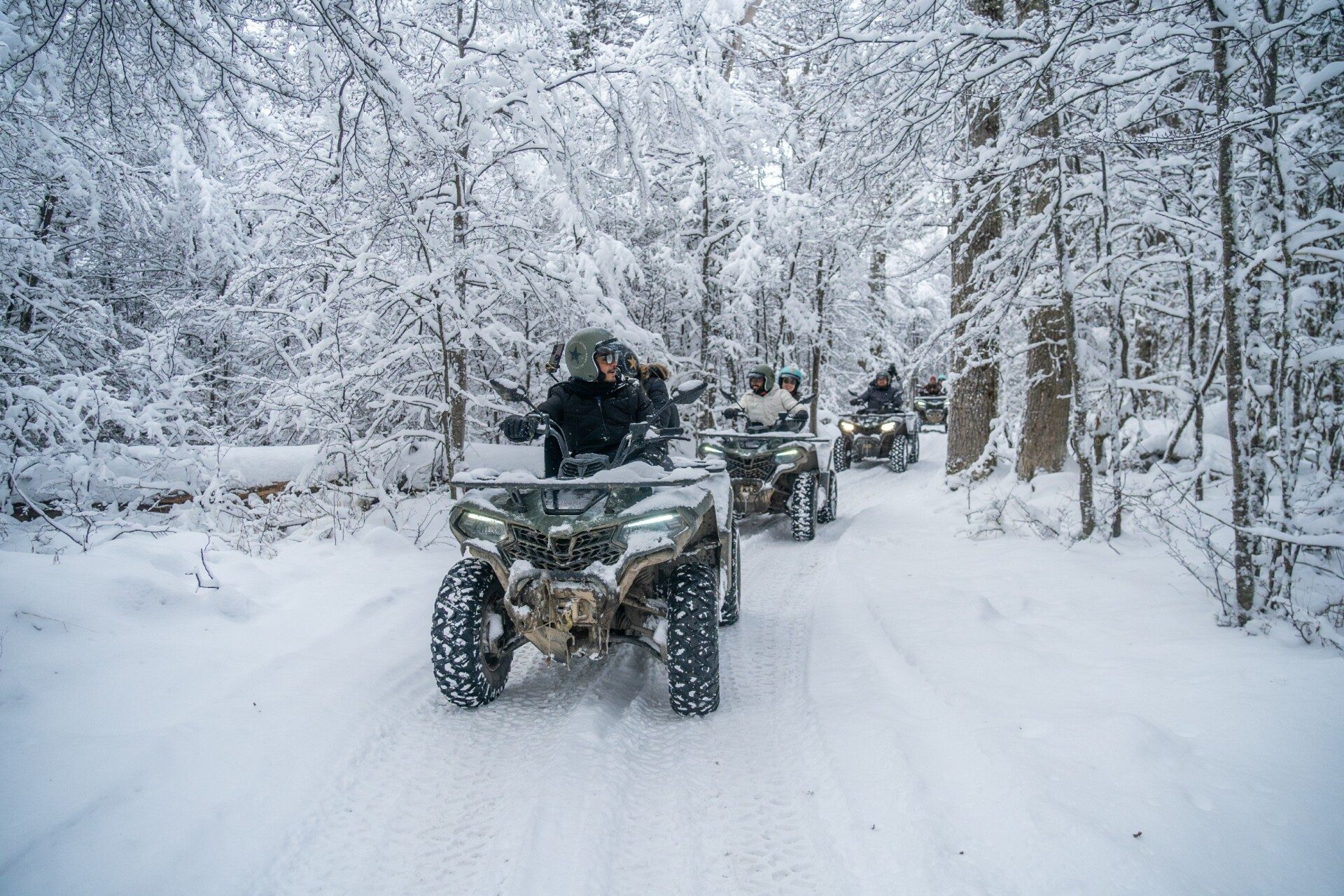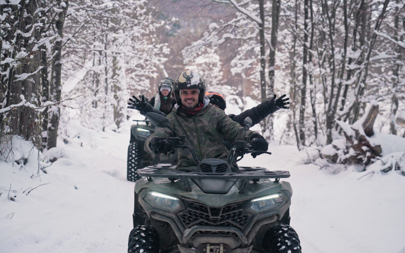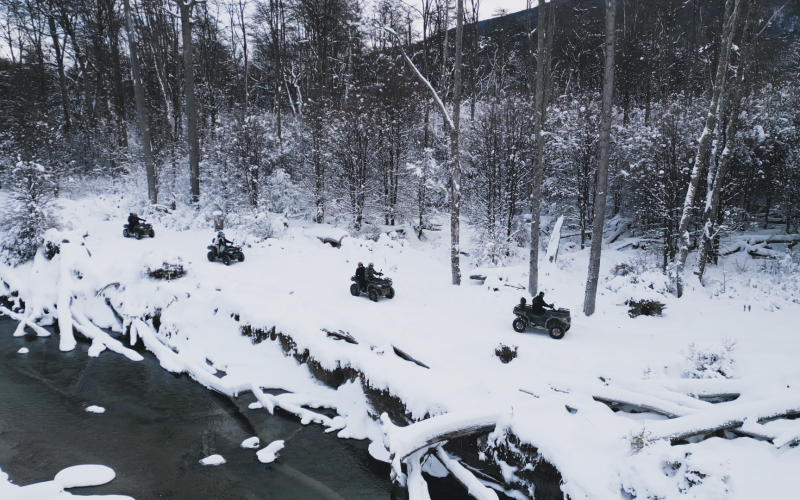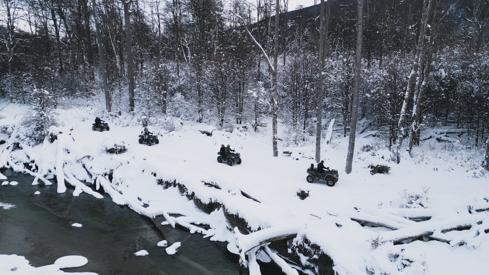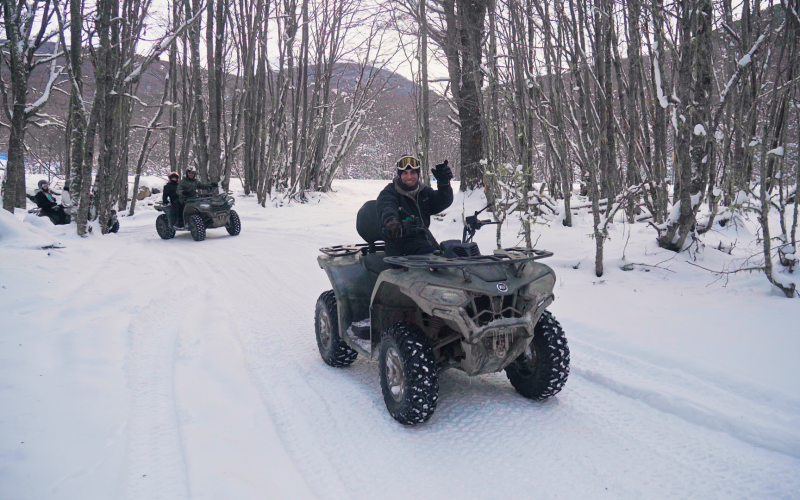 A aventura começa com um emocionante passeio de quadriciclo pela neve, cerca de 25 minutos de pura adrenalina, cercados por paisagens brancas deslumbrantes que despertam o espírito de exploração e aventura.