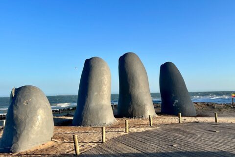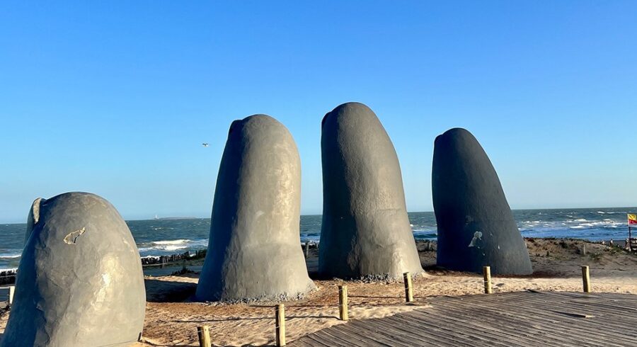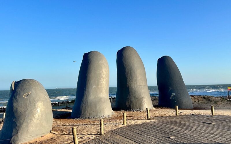 Saída de Montevidéu, no caminho vista panorâmica das praias de Montevidéu e da Costa do Ouro, em direção a Punta Ballena para visitar a famosa Casa Pueblo (sem acesso), casa e escultura de Carlos Paez Vilaros, pintor uruguaio.