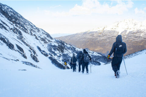Ao chegarmos, colocaremos os equipamentos necessários para o percurso, grampones (se houver muito gelo e neve) e bastões.