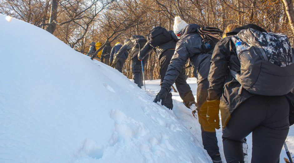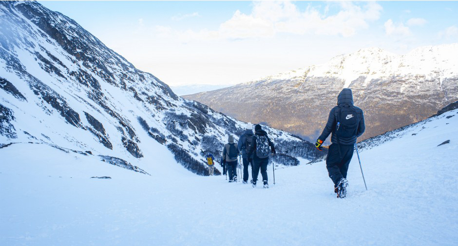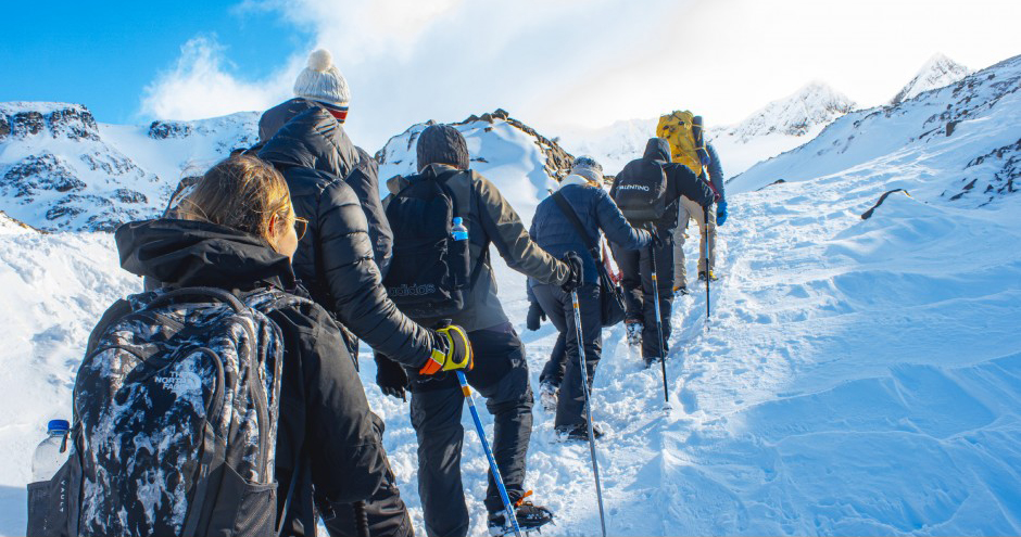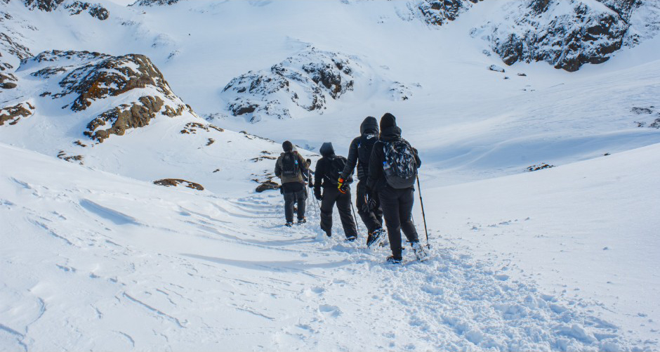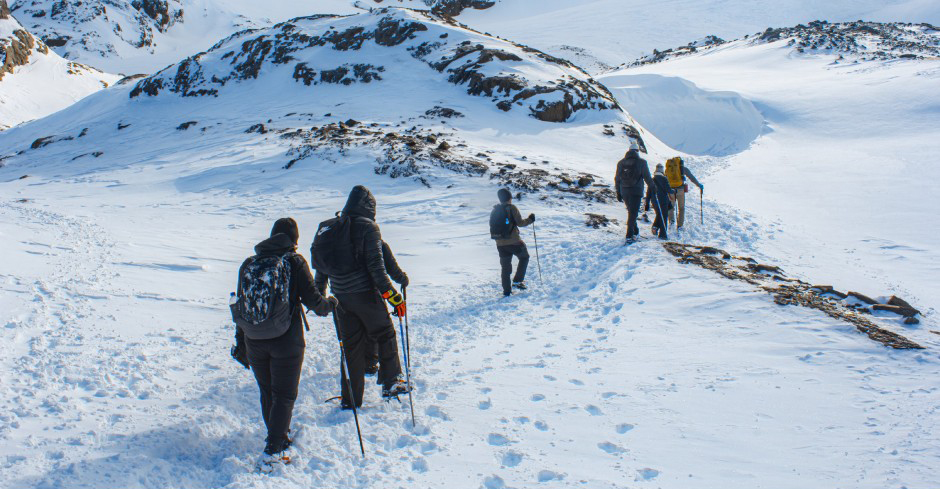 Ao chegarmos, colocaremos os equipamentos necessários para o percurso, grampones (se houver muito gelo e neve) e bastões.
