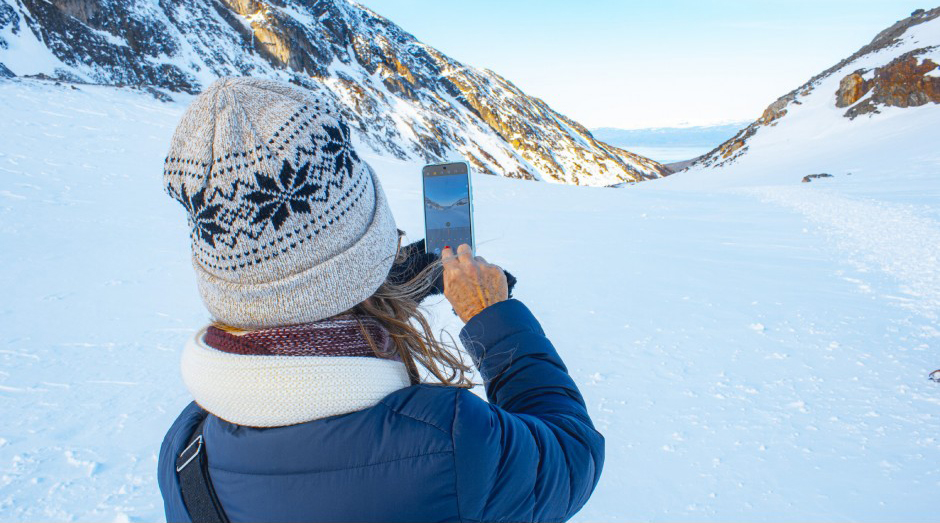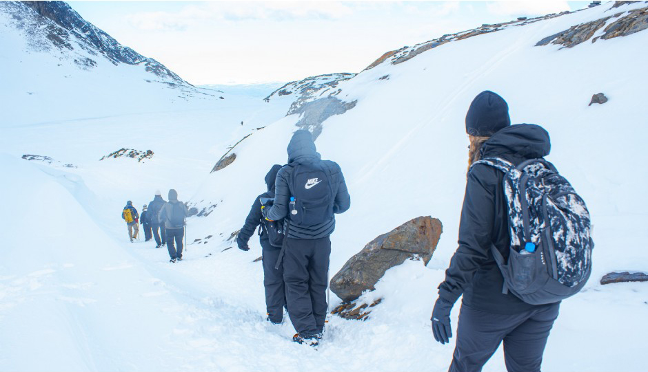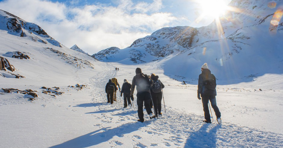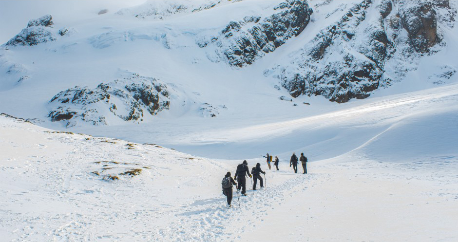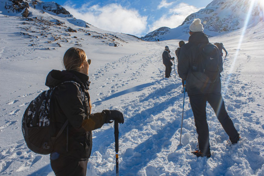 Cercados por montanhas nevadas, enfrentamos uma subida por mais de uma hora, encorajados pela magnificente vista que vai sendo descoberta à medida que subimos.