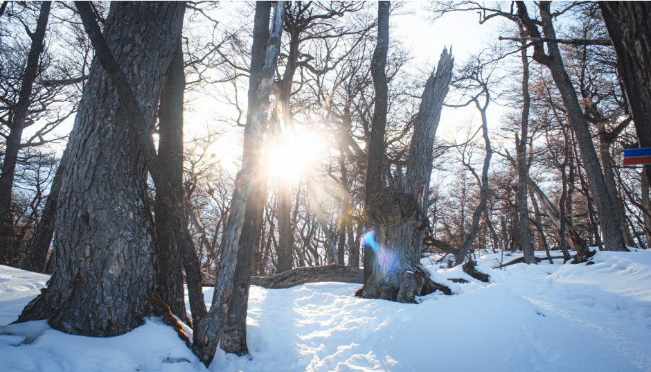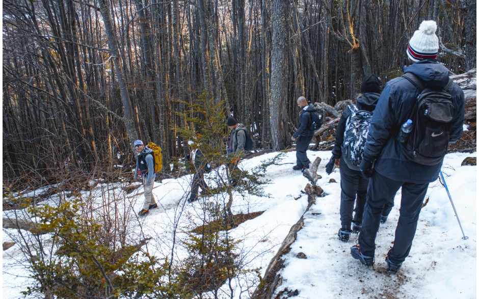 Em seguida, entraremos no bosque de lengas. As lengas e nires são árvores típicas da Patagônia e nos oferecem lindas imagens em virtude de suas formas inusitadas. Com a sensação de paz proporcionada pelo bosque, continuamos nossa jornada até chegarmos à base de uma cachoeira, onde paramos por alguns minutos para repor as energias e saborear uma fruta.