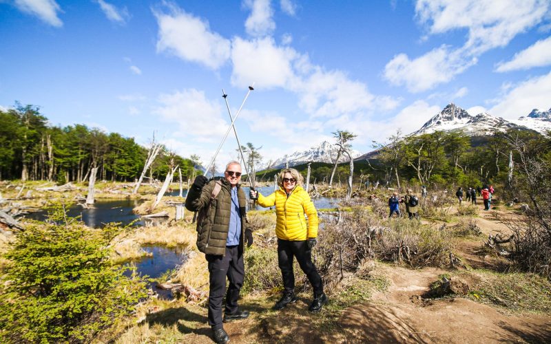 Depois de ouvirmos de nosso guia as instruções sobre nosso trekking de 4,7 km, adentramos um denso bosque de Lengas, caminhando em um solo esponjoso, conhecido como turbas. Seguimos à margem de riachos de coloração ímpar. Logo iremos nos deparar com as castoreiras – diques construídos pelos castores -, que causam grande impacto no meio ambiente. Nosso guia fará uma pausa para nos contar essa história, bem como outras características da flora e fauna da região.